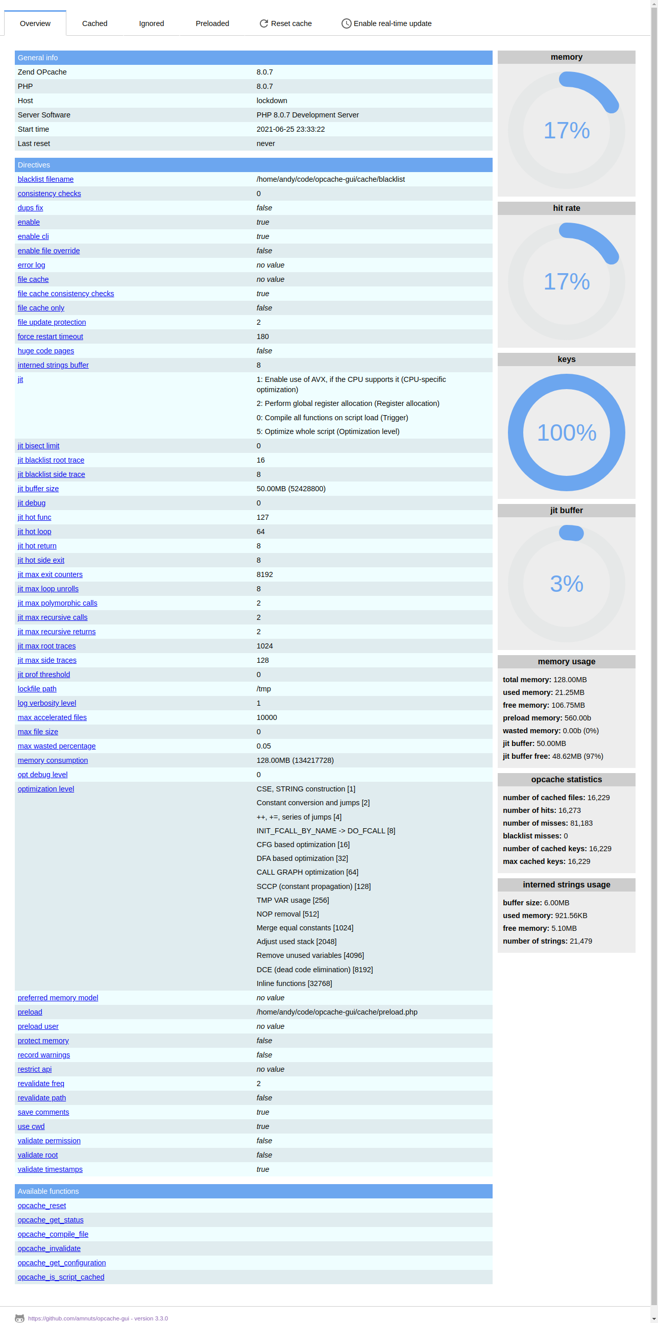 ]))->handle();The overview will show you all the core information. From here you'll be able to see what host and platform you're running on, what version of OPcache you're using, when it was last reset, the functions and directives available (with links to the php.net manual), and all the statistics associated with the OPcache (number of hits, memory used, free and wasted memory, and more).