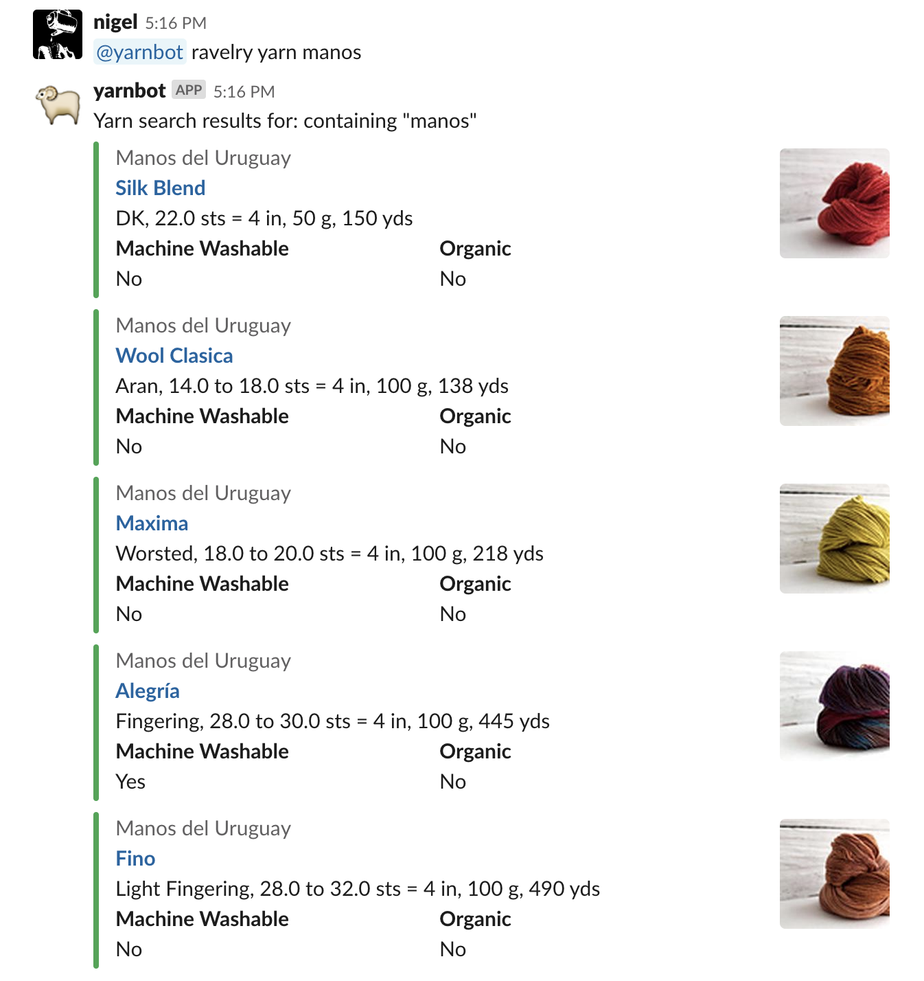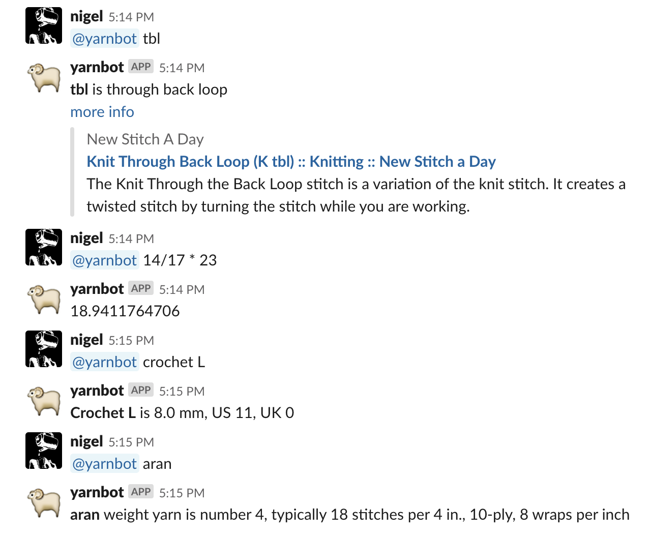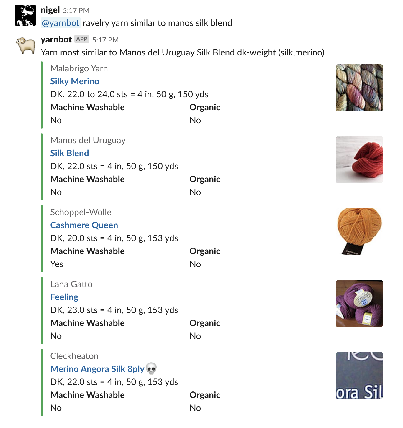 Yarnbot is a Slack-bot that knows some yarn-working things, and can search Ravelry for patterns, yarn, or user favorites.
